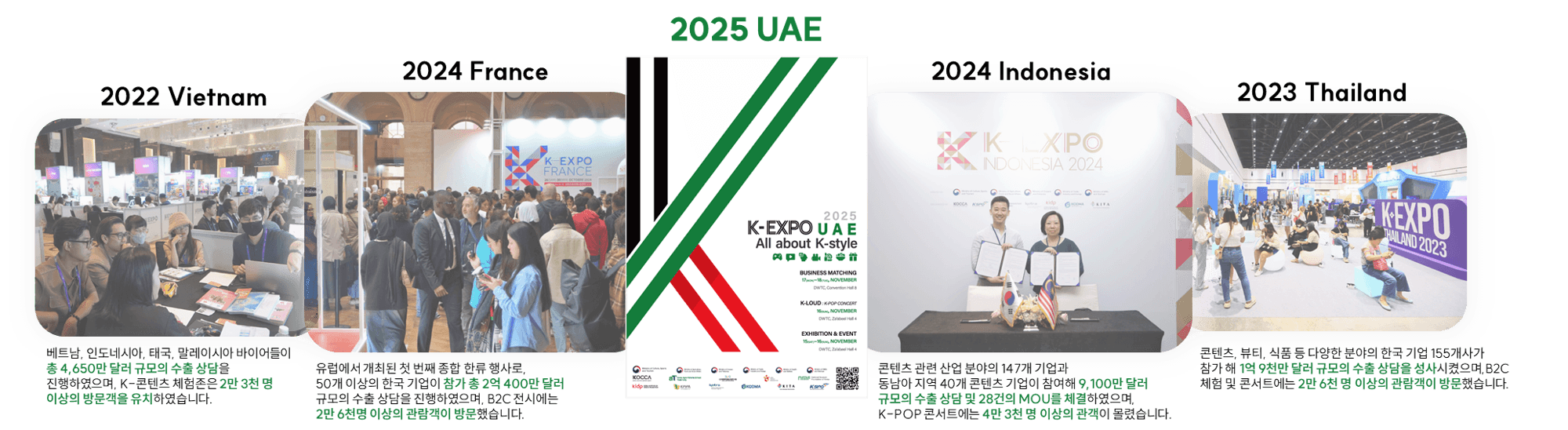 이번 2025 UAE K-박람회는 관계부처 합동 한류 박람회로, 아랍에미레이트 두바이에서 개최됩니다.